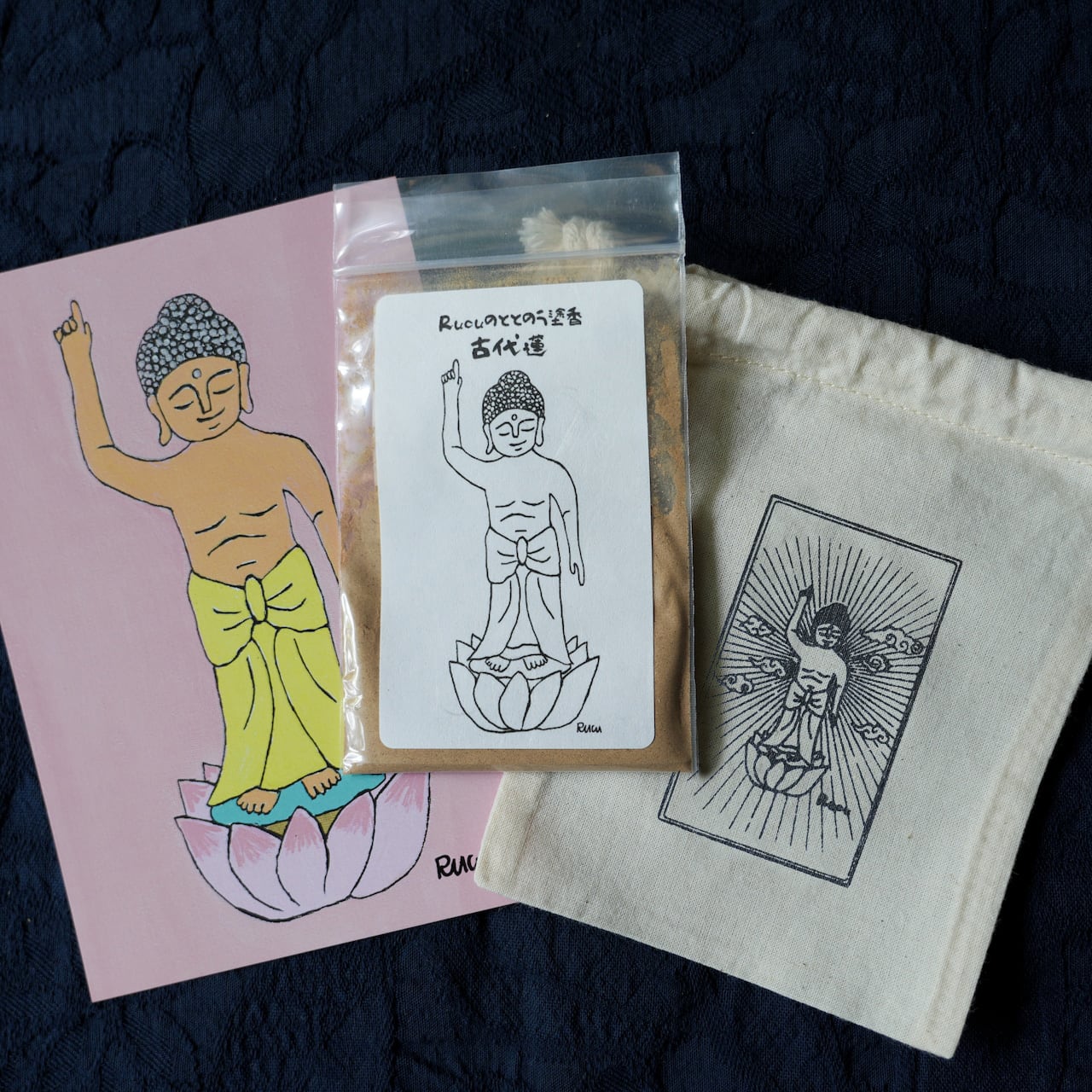 この塗香のために、Rucuが描き下ろした「蓮にのった誕生仏」のアートを